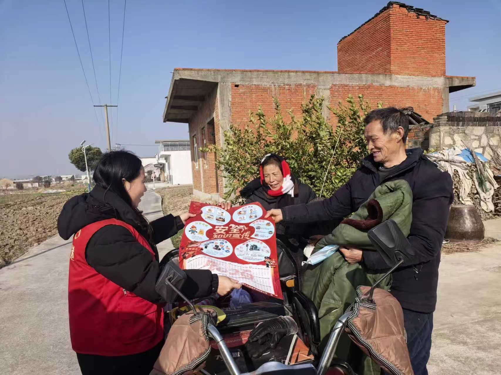 2月3日上午,在肥东县包公镇阚集社区朱东组67岁独居老人茆荣圣家大门前,社区老幼专干闫勤倩抱着一些宣传年画挂历,正在与老人亲切交流,闫勤倩展示安全年画的内容,一边向老人宣传防溺水、防火、防寒保暖、防诈骗、骑电动车、烟花炮竹禁放等安全知识,走进在老人家中,查看排查老人家中用火用电安全的隐患,直到满意为止。