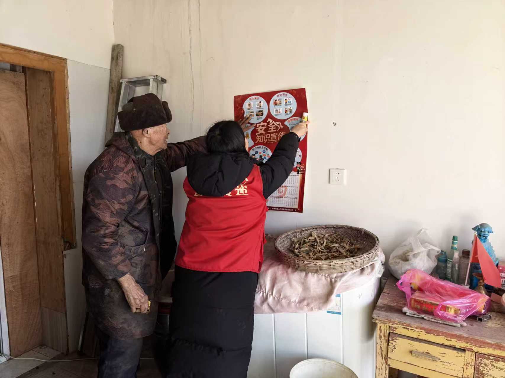 随后,闫勤倩又先后走访了朱东组66岁独居老人朱远民和朱西组70岁独居老人阚延培等7个村名组,为6名独居老人和4位留守老人送上安全年画,将一些安全防护措施交给老人,每到一家,闫勤倩必查看老人家的安全用电用火用气的具体情况,普及安全知识的同时,询问需要提供的帮助,帮助老人把年画贴在墙上。