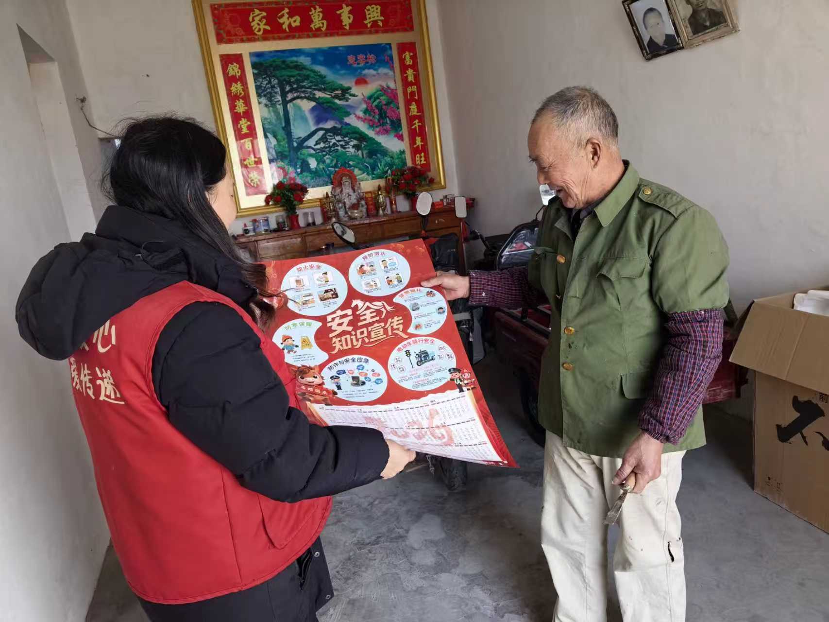 “这不快要过年了嘛,按照县乡村三级工作部署,这次是来给您送安全年画来的,过好年,安全第一啊,茆大爷,您看这年画多美,上面的安全提示很全面的,您老看看。”