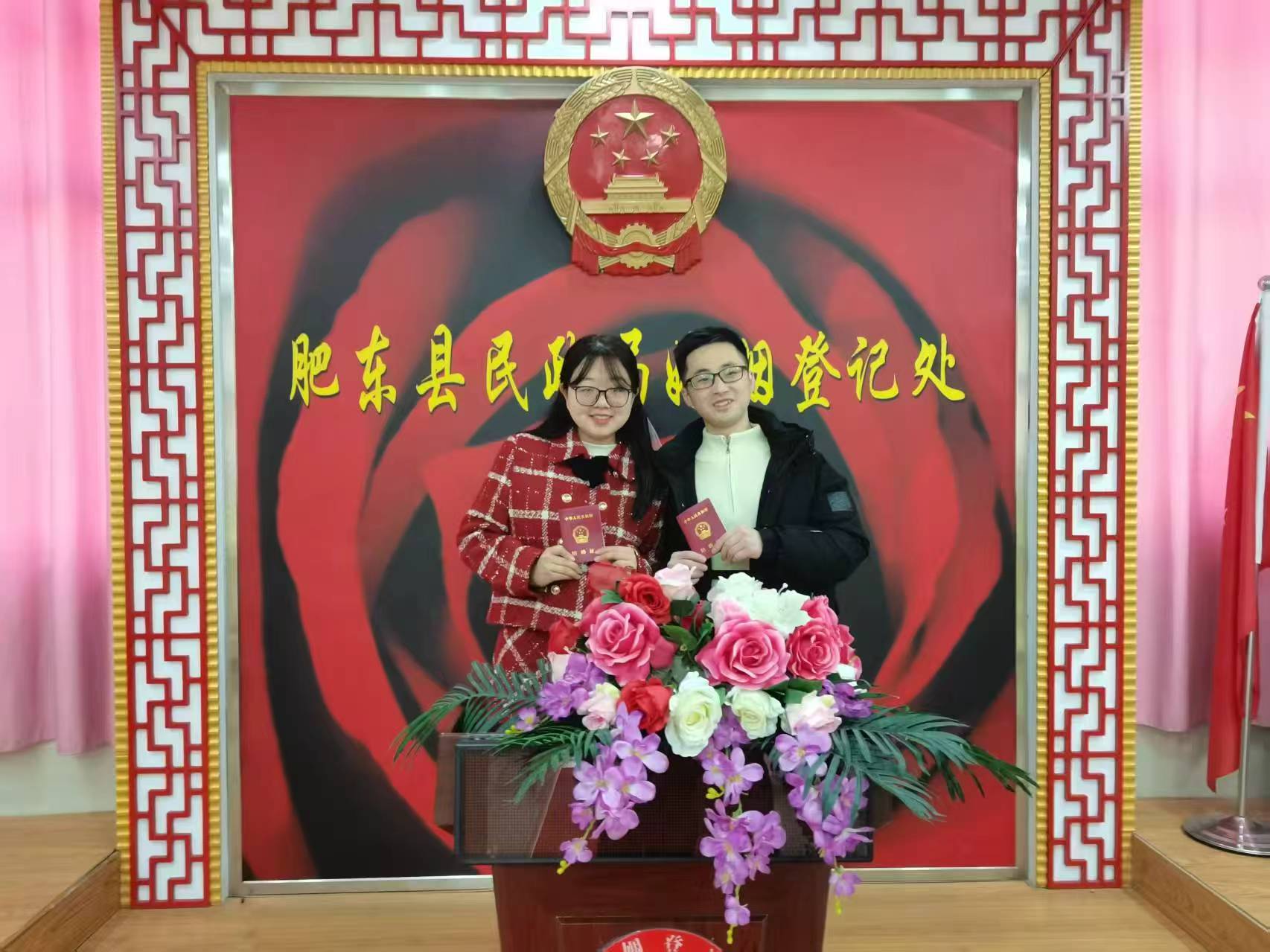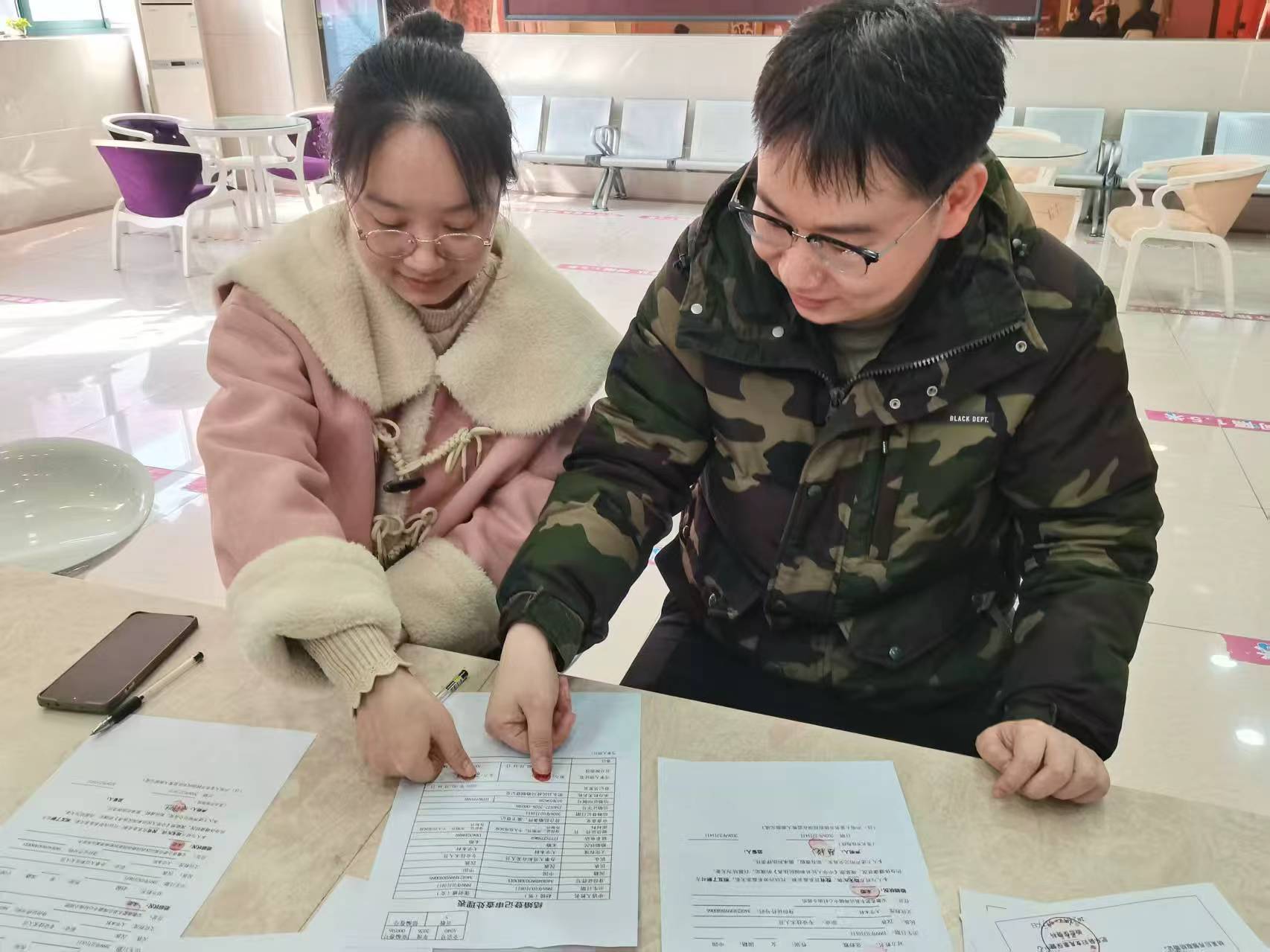 望着来自店埠镇幸福的一对人,登记员李冠芳微笑相迎,随着“啪”的一声钢印响起,宣告着法定幸福即时生效。