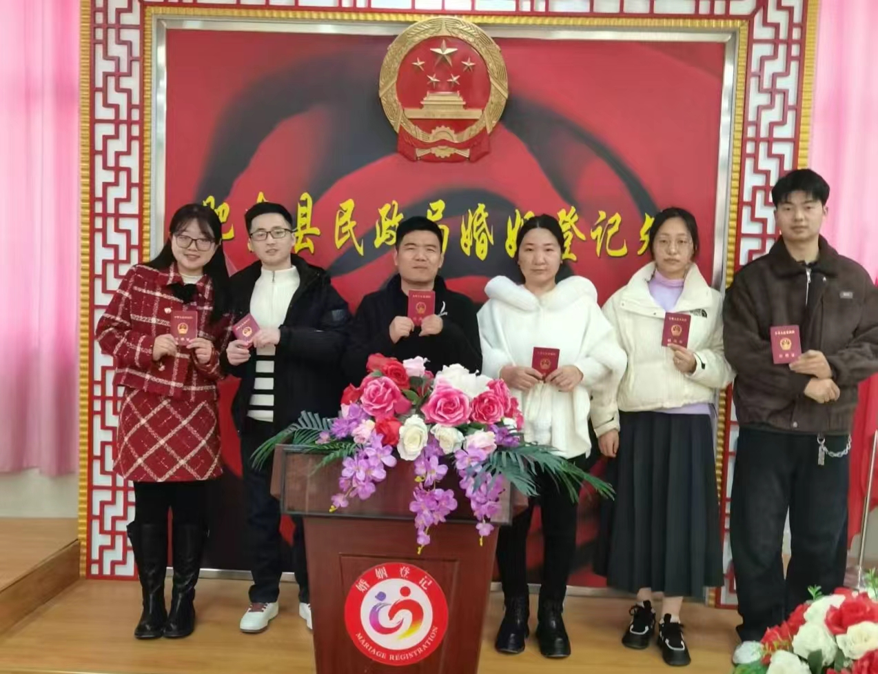 “我们在一起合照吧”,程女士又邀请刚刚领完证的其他两对新人,共同见证幸福时刻。(肥东县民政局 高桢)