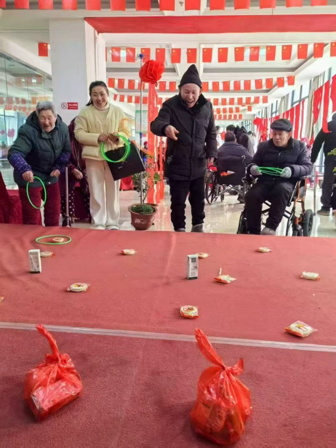 与此同时,在另个活动现场,几十位老人正在一起唱红歌,齐整整的声音却并没有打扰一旁正在进行趣味比赛:套圈,只见老人们有序地按照先来后到的顺序,手拿塑料圈,瞄准着自己心仪的礼物,轻轻往目标抛去……
