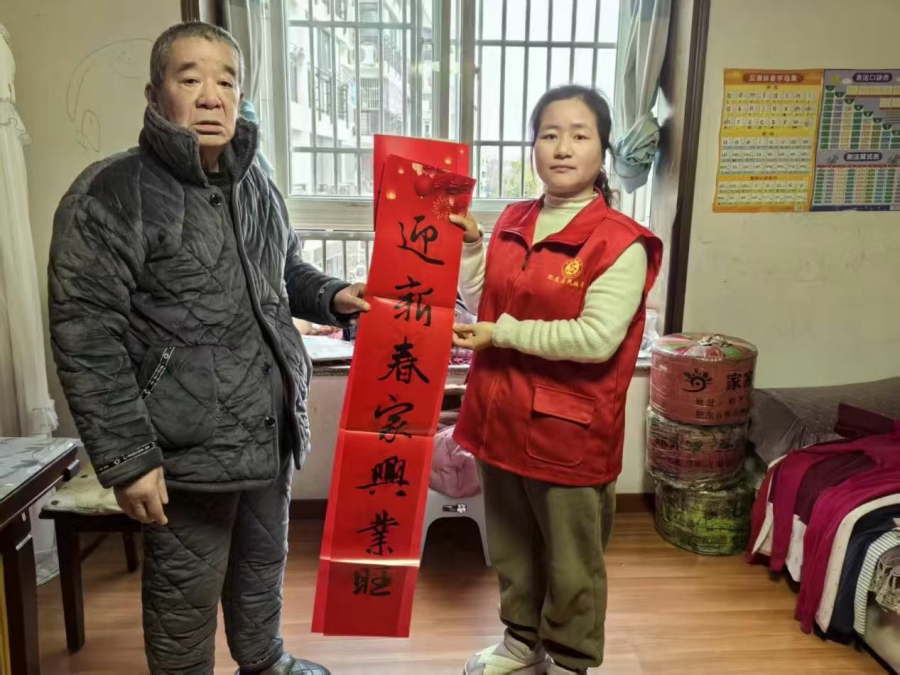 此外,志愿者们还特意为老人们准备了象征吉祥如意的春联和大红“福”字。他们将一幅幅满载新年祝福的春联和“福”字送到每位老人手中,红红的春联,洋溢着节日的喜庆,更凝聚着深情的祝福,传递着无比温暖。(肥东县民政局 高桢 开华)